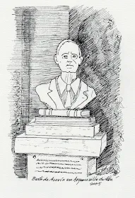 (Dibujo a plumilla de Azorín, busto en Argamasilla del Alba . 2005, por Ramón Fdez.)